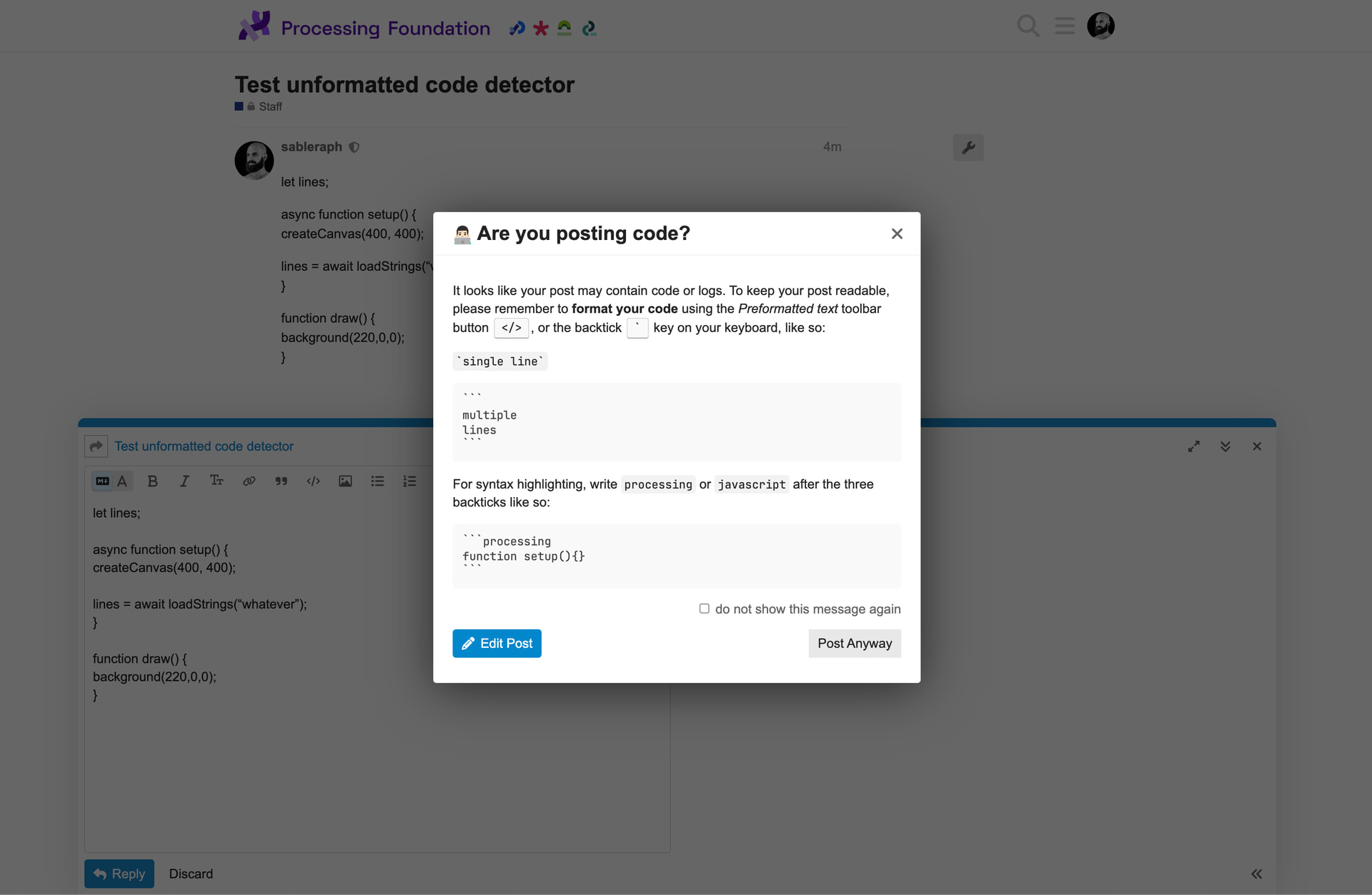 A quick quality-of-life update: we’ve installed an official Discourse plugin that warns you when a post might contain unformatted code. This has been a pain point for all of us for a very long time, and it’s nice to finally have a built-in solution.